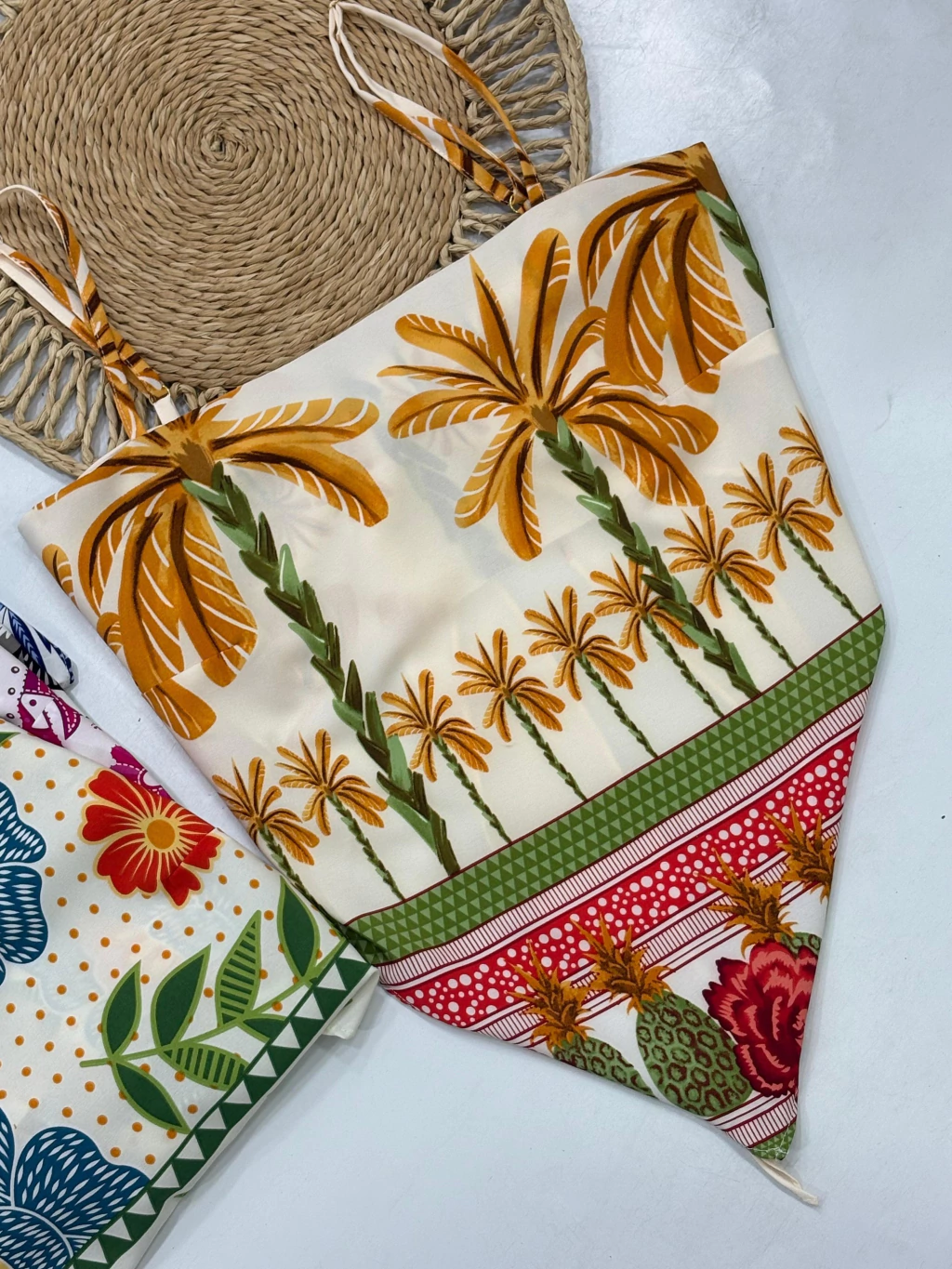 Blusa lenço bico feminina, feita em tecido leve e fluido, com alças finas. O modelo apresenta acabamento em ponta (bico) na barra, trazendo um visual moderno e estiloso. As estampas tropicais e florais deixam a peça vibrante e perfeita para looks de verão. Ideal para usar com shorts, saias ou calças leves.