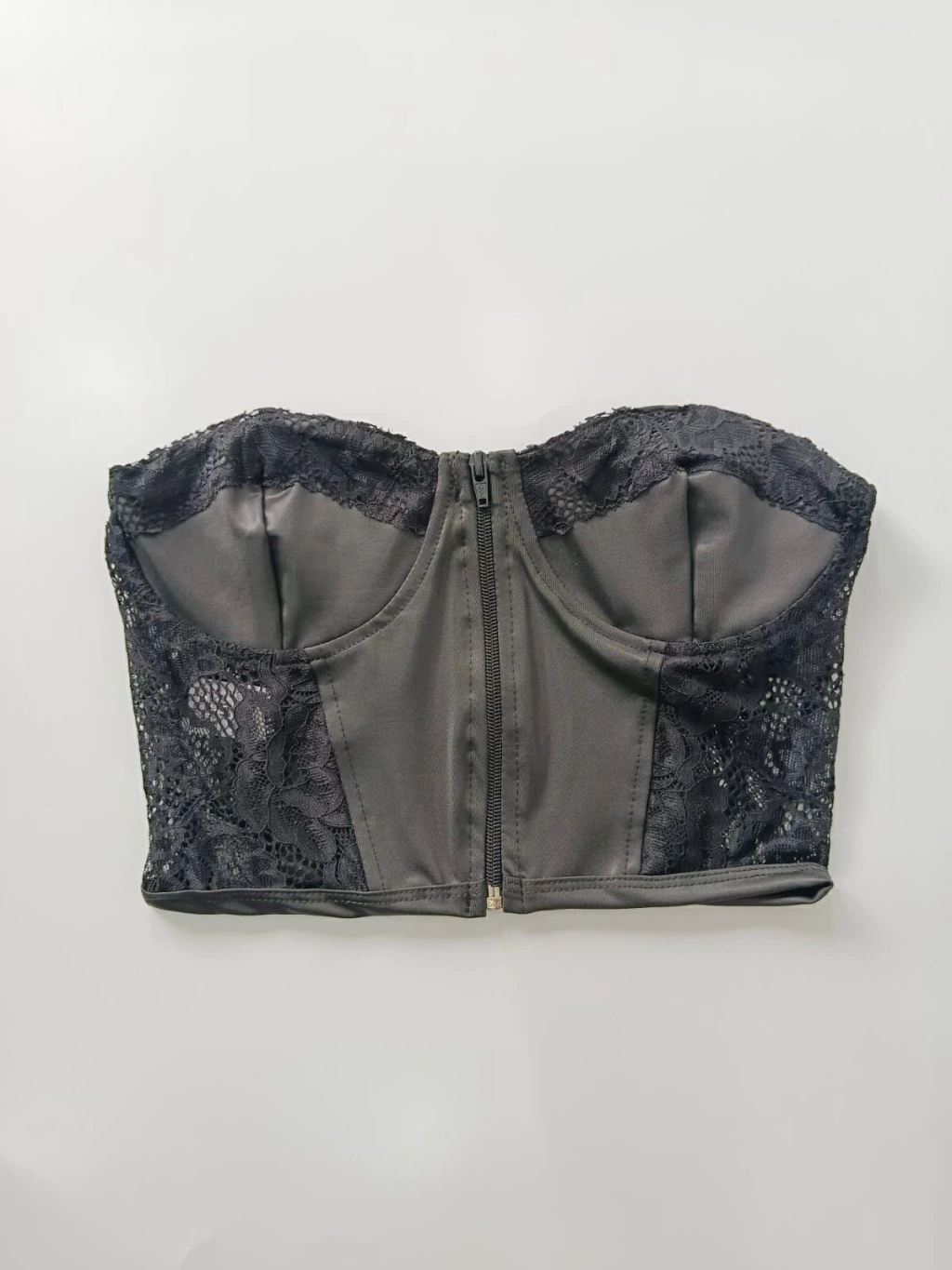Possui barbatanas flexíveis que garantem conforto e firmeza ao vestir, além de fecho ajustável nas costas para melhor adaptação ao corpo. O detalhe em renda transparente adiciona um toque de mistério e feminilidade, ideal para compor looks sensuais ou como peça-chave em produções fashionistas.
