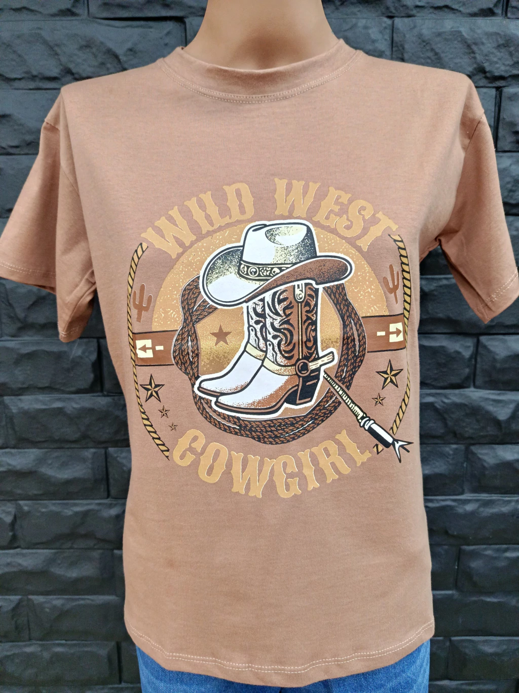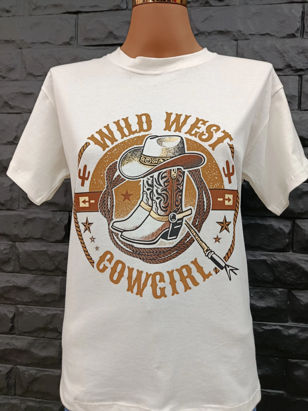 T-shirt feminina com estampa estilo faroeste, trazendo bota, chapéu e o texto "Wild West Cowgirl". Ideal para compor looks descolados com uma pegada country. Confortável, com modelagem reta e gola redonda.